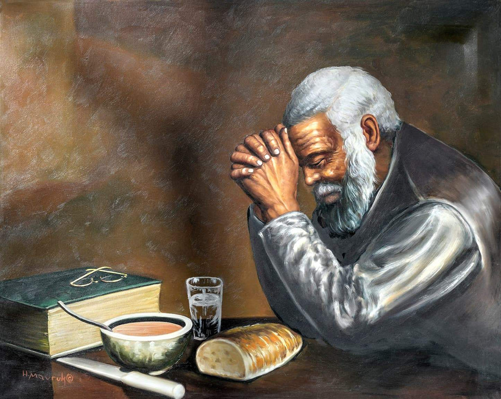 Grace: Oil on Canvas- An old man saying grace before a dinner of bread, soup, and water.