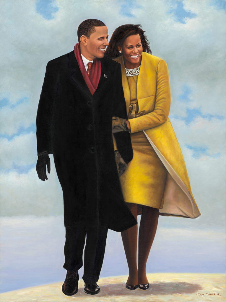 Famous Walk- Obama and Michelle: The first African American President and first lady smiling as they walk together. Without a doubt one of the most important and iconic images of Michelle in a yellow dress and coat smiling beautifully holding Barack Obama as they walk together into the future.